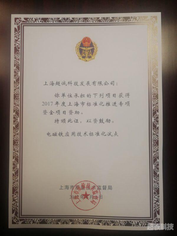 上海超誠科技發(fā)展有限公司獲得電磁鐵應(yīng)用技術(shù)標(biāo)準(zhǔn)化試點(diǎn)項(xiàng)目上海市專項(xiàng)資金項(xiàng)目資助
