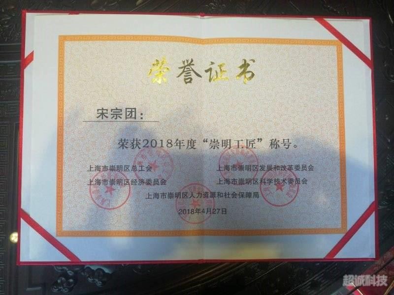 超誠(chéng)科技宋宗團(tuán)先生榮獲2018屆崇明工匠以及優(yōu)秀標(biāo)兵